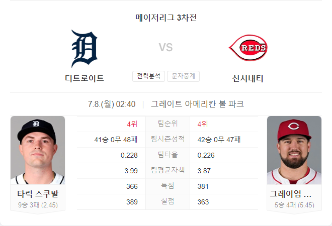 디트로이트 타이거즈는 이번 시리즈에서 에이스 타릭 스쿠발을 앞세워 신시내티 레즈를 상대로 승리를 거둘 가능성이 높습니다. 스쿠발은 이번 시즌 17경기 중 12경기에서 퀄리티 스타트를 기록하며 안정된 투구를 보여주고 있으며, 레즈의 주력 타자인 드 라 크루즈를 약한 쪽에서 상대할 수 있을 것입니다.