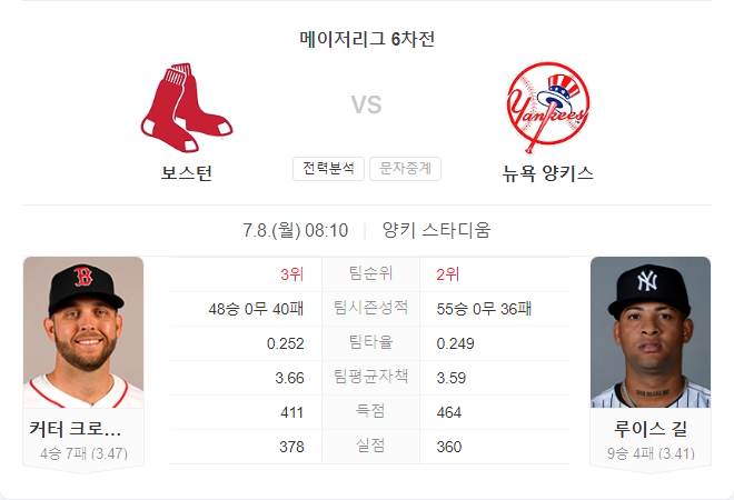 현재 보스턴 레드삭스의 흐름을 보면 뉴욕 양키스를 상대로 승리할 가능성이 높아 보입니다. 크로포드는 원정 경기에서 특히 강한 모습을 보이며, 양키스 타선을 상대로도 좋은 성적을 기록하고 있습니다. 반면, 양키스의 길은 최근 경기에서 부진한 모습을 보이고 있어 보스턴 타선에게 고전할 가능성이 큽니다.