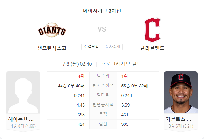 반면, 클리블랜드 가디언스는 카를로스 카라스코의 경험과 안정된 투구력을 바탕으로 홈 경기에서 우위를 점할 가능성이 큽니다. 가디언스는 공격력에서도 자이언츠보다 우세하며, 홈 경기에서의 이점을 살려 경기를 승리로 이끌 것으로 예상됩니다.