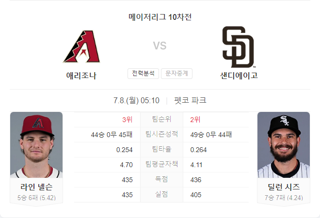 반면, 애리조나의 라이언 넬슨은 이번 시즌 파드리스를 상대로 어려움을 겪고 있으며, 최근 성적도 좋지 않습니다. 딜런 시즈는 애리조나를 상대로 좋은 성적을 보이고 있어 파드리스의 승리가 유력해 보입니다.