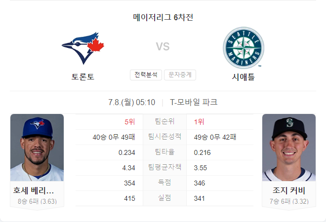 7월 8일 MLB 토론토 블루제이스 VS 시애틀 매리너스 타카짱의 경기 예측 분석