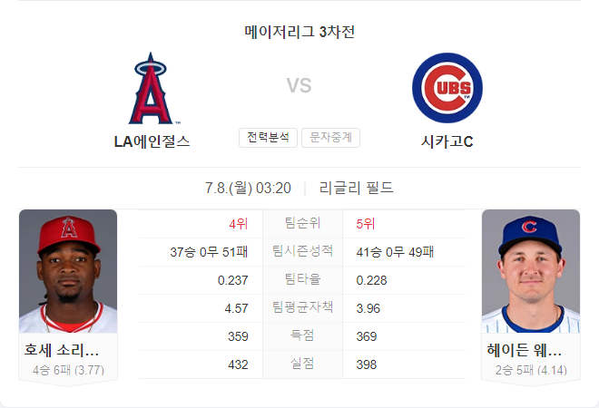 컵스의 헤이든 웨스네스키는 최근 부진한 모습을 보이고 있어 에인절스의 공격진이 그의 약점을 공략할 수 있을 것으로 예상됩니다. 양팀의 타격력이 전반적으로 저조한 만큼, 이번 경기는 낮은 득점 경기로 예상되며 에인절스가 승리할 가능성이 큽니다.