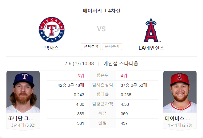 7월 9일 MLB 텍사스 레인저스 VS LA 에인절스 타카짱의 경기 예측 분석
