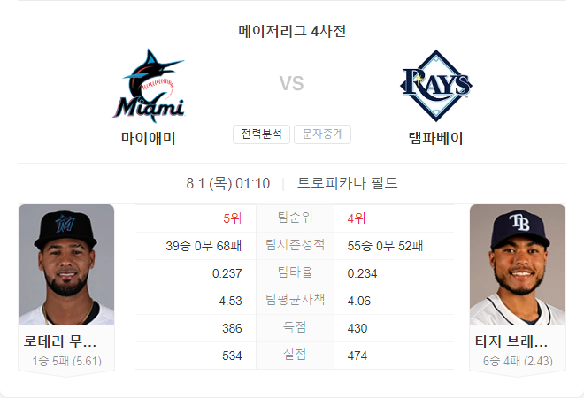이번 경기는 탬파베이 레이스가 유리할 것으로 보입니다. 마이애미의 루키 투수 무뇨즈는 시즌 동안 기복 있는 모습을 보였고, 탬파베이의 브래들리는 최근 강력한 투구를 이어가고 있습니다. 마이애미는 주요 선수들이 트레이드되면서 타선이 약화되었고, 탬파베이는 여전히 와일드카드 경쟁을 이어가기 위해 승리가 절실합니다. 따라서 탬파베이가 핸디캡 -1.5로 승리할 가능성이 높습니다.