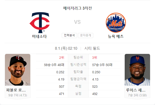 8월 1일 MLB 미네소타 트윈스 VS 뉴욕 메츠 타카짱의 경기 예측 분석