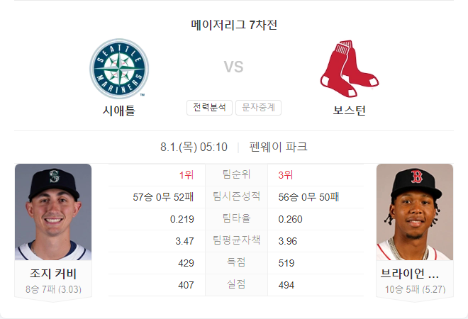 이번 경기는 시애틀 매리너스가 우위를 점할 것으로 예상됩니다. 조지 커비의 안정적인 투구와 브라얀 벨로의 부진이 주요 요인이 될 것입니다. 매리너스 타선이 벨로를 공략해 점수를 뽑아내고, 커비가 레드삭스 타선을 잘 막아낼 것으로 보입니다. 따라서 매리너스가 이길 가능성이 높습니다.