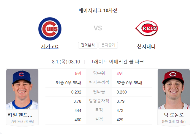 이번 경기는 신시내티 레즈가 우세할 것으로 보입니다. 카일 헨드릭스의 부진한 원정 성적과 닉 로돌로의 안정적인 투구가 주요 요인입니다. 레즈는 최근 경기에서 컵스를 상대로 좋은 성적을 기록하고 있으며, 이번 경기에서도 그 흐름을 이어갈 것으로 예상됩니다.