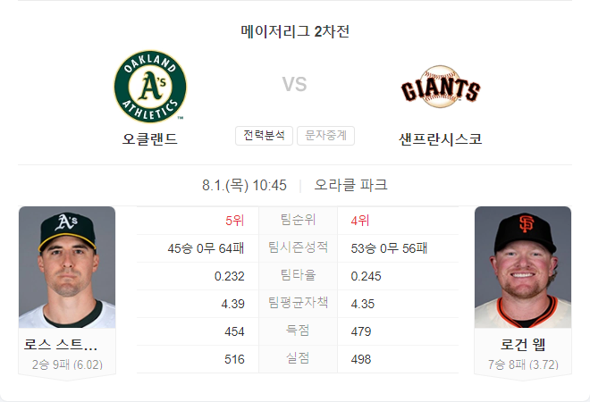 이번 경기는 양 팀 모두에게 중요한 경기입니다. 오클랜드는 최근 좋은 흐름을 이어가고 있지만, 선발 투수 스트립링의 부진한 성적이 변수로 작용할 수 있습니다. 반면, 자이언츠는 홈에서 강한 모습을 보이며, 로건 웹의 반등을 기대할 수 있습니다. 타선에서도 자이언츠가 더 나은 성적을 보이고 있어, 이번 경기는 자이언츠가 승리할 가능성이 높아 보입니다.