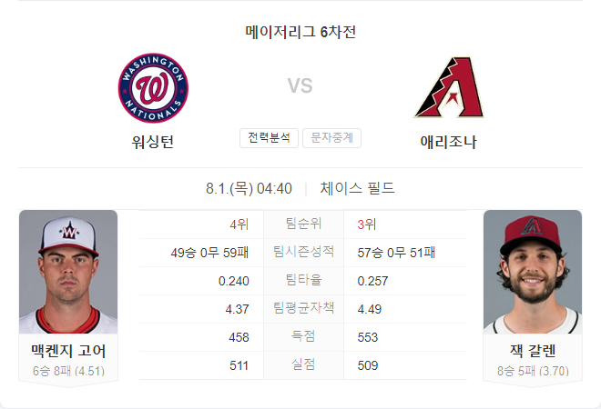 8월 1일 MLB 워싱턴 내셔널스 VS 애리조나 다이아몬드백스 타카짱의 경기 예측 분석