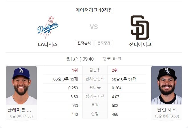 LA 다저스는 이번 시즌 내셔널 리그 서부 지구 선두를 달리고 있으며, 또 한 번의 지구 우승을 노리고 있습니다. 다저스는 최근 트레이드 마감일을 앞두고 토미 에드먼, 아메드 로사리오, 그리고 클로저 마이클 코펙을 영입하며 전력을 강화했습니다. 다저스는 이번 시리즈에서 클레이튼 커쇼를 선발로 내세우는데, 그는 부상에서 회복한 후 두 번째로 출전하는 경기입니다. 커쇼는 첫 경기에서 4이닝 동안 6피안타 2실점을 기록하며 안정적인 모습을 보였습니다. 커쇼는 샌디에이고 파드리스를 상대로 통산 23승 10패, ERA 2.12를 기록하고 있습니다.