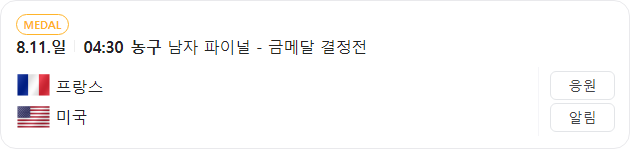 | 8월 11일 올림픽 여자 농구 프랑스 VS 미국 타카짱 경기 예측 분석 (0) | 2024.08.10 |