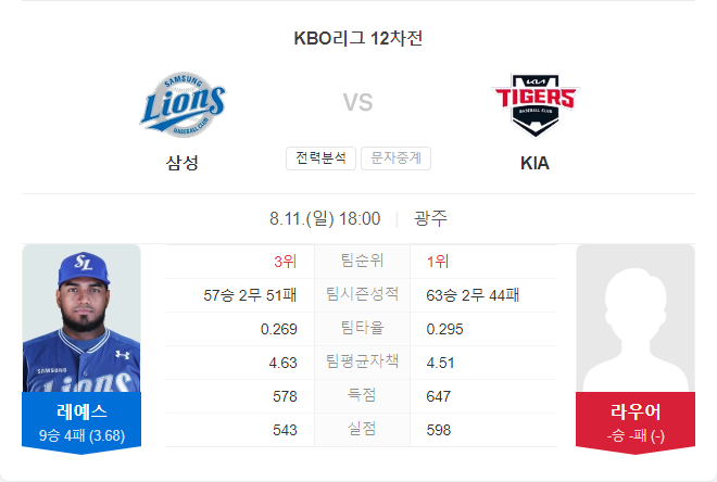 삼성의 선발 투수 레예스는 올 시즌 9승 4패를 기록하며 좋은 성적을 유지하고 있습니다. 평균자책점(ERA) 3.68, WAR 3.19로 안정적인 투구를 보여주고 있으며, 시즌 전체적으로는 좋은 성과를 거두고 있습니다. 그러나 KIA를 상대로는 2패를 기록하고 있어 다소 불안한 점도 있습니다. 타선에서는 김헌곤이 키플레이어로, 최근 높은 타율을 유지하며 팀의 득점을 이끌고 있습니다. 하지만 전체적인 팀 평균자책점이 6.07로 높아, 마운드에서의 안정감이 부족한 것이 약점으로 작용할 수 있습니다.