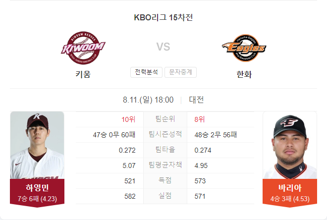 | 8월 11일 KBO 크보 삼성 VS 기아 타카짱 경기 예측 분석 (0) | 2024.08.11 |
