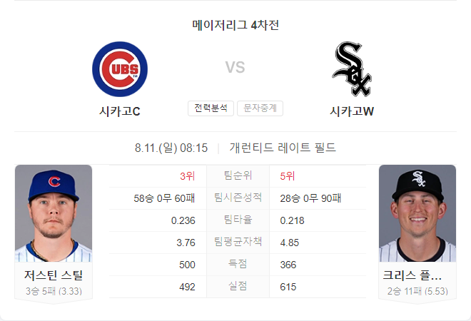 시카고 화이트삭스는 이번 시즌 전반적으로 어려움을 겪고 있으며, 최근 23경기에서 단 한 번만 승리를 거두었습니다. 크리스 플렉센이 선발로 나서지만, 최근 경기에서의 부진한 투구로 인해 이번 경기에서도 어려움이 예상됩니다. 팀 전체가 공격과 수비에서 모두 부진한 모습을 보이고 있어 컵스를 상대로 승리를 거두기 위해서는 상당한 노력이 필요할 것입니다. 현재 팀의 분위기나 성적을 고려할 때, 화이트삭스가 이번 경기를 승리로 이끌기는 쉽지 않을 것으로 보입니다.