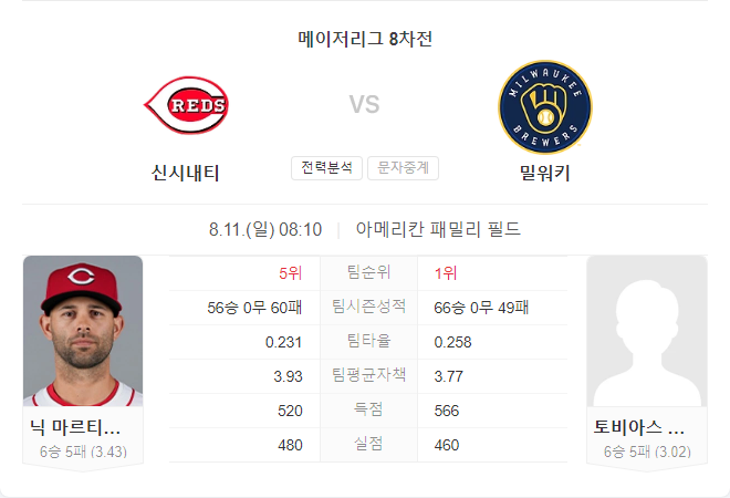 8월 11일 MLB 믈브 신시내티 VS 밀워키 타카짱 경기 예측 분석
