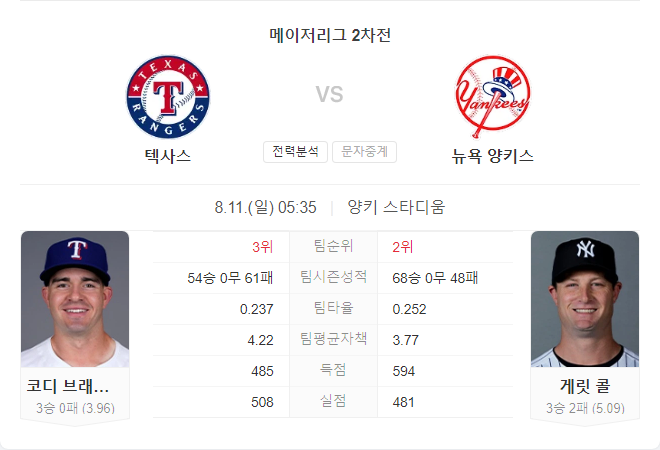 이번 경기는 뉴욕 양키스가 홈에서 유리한 위치에 있으며, 게릿 콜이 텍사스의 부상 문제를 활용해 안정적인 경기를 펼칠 가능성이 큽니다. 텍사스 레인저스가 부상으로 인해 선발 투수진에 문제가 있기 때문에, 양키스가 이 경기를 승리로 이끌 가능성이 높습니다.