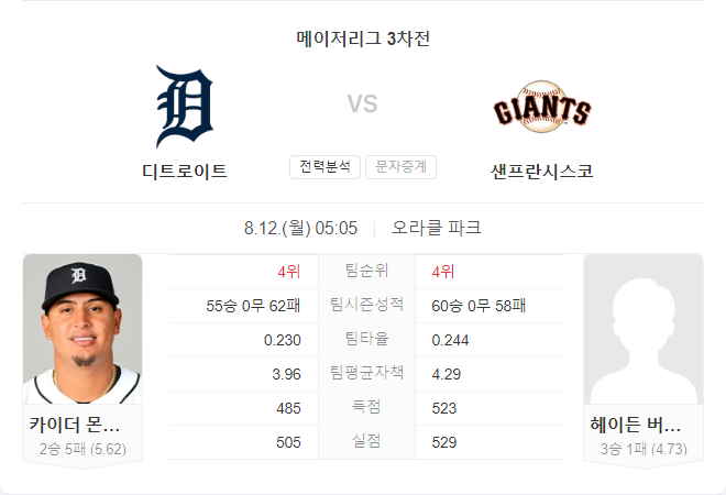 | 8월 12일 MLB 메이저리그 애틀랜타 브레이브스 VS 콜로라도 로키스 타카짱 경기 예측 분석 (0) | 2024.08.11 |