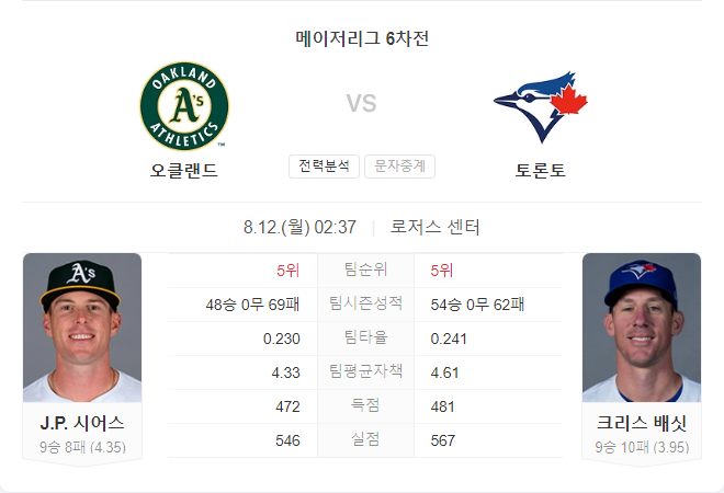 최근 3경기에서는 2승 1패, 평균 자책점 3.60으로 안정적인 투구를 선보였으며, 이번 경기가 그가 로저스 센터에서 첫 선발 등판하는 경기입니다. 오클랜드는 시즌 내내 리그 하위권에 머물러 있으며, 이번 경기에서 반등을 노리지만 어려운 상황입니다.