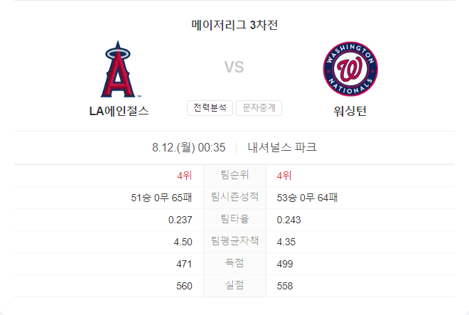LA 에인절스와 워싱턴 내셔널스는 모두 시즌 내내 불안정한 모습을 보였습니다. 에인절스는 타선과 마운드에서의 문제로 인해 어려운 경기를 펼칠 가능성이 높으며, 워싱턴은 홈경기의 이점을 활용해 조금 더 유리한 위치에 있을 수 있습니다.
