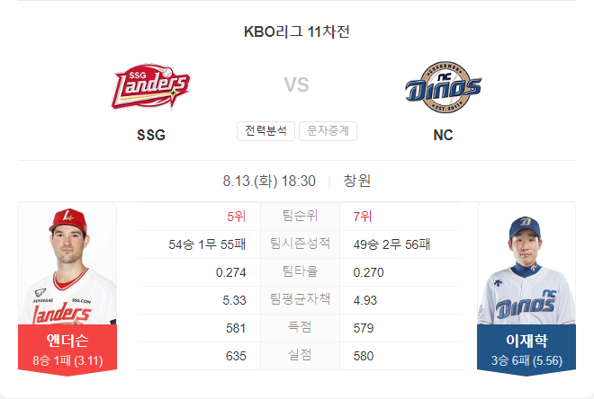 8월 13일 KBO 크보 SSG 랜더스 VS NC 다이노스 타카짱 경기 예측 분석
