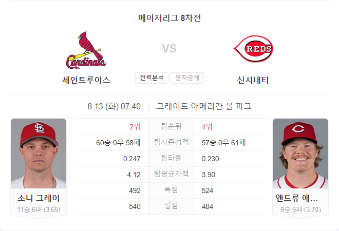 이번 경기는 양 팀 모두에게 중요합니다. 카디널스는 소니 그레이의 호투가 기대되며, 레즈는 앤드류 애벗이 반등할 수 있을지가 관건입니다.