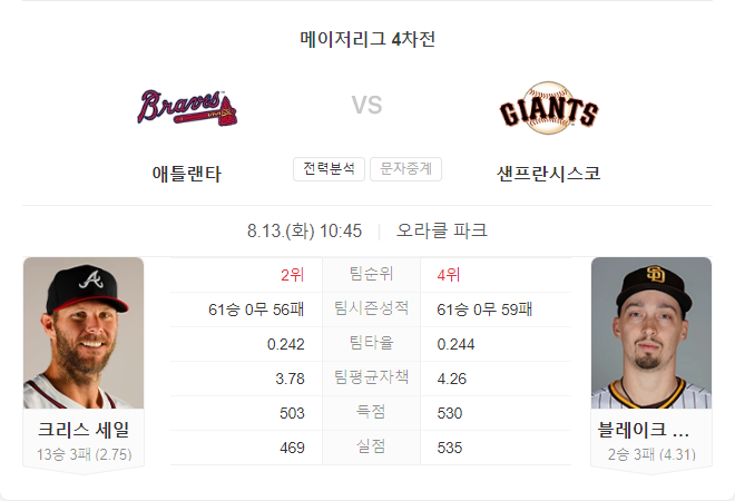 8월 13일 MLB 메이저리그 애틀랜타 브레이브스 VS 샌프란시스코 자이언츠 타카짱 경기 예측 분석