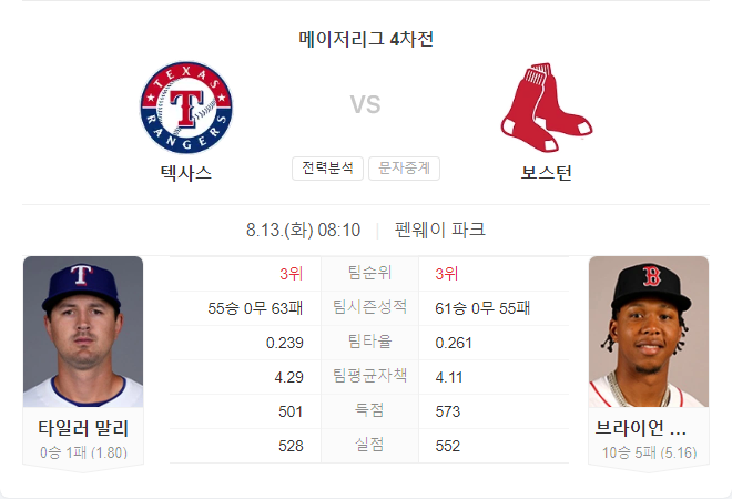 텍사스 레인저스는 타일러 말레의 두 번째 선발 출전이 변수로 작용할 가능성이 있으며, 보스턴 레드삭스는 브라이언 벨로의 구위에 기대를 걸고 있습니다. 홈에서 강한 보스턴이 다소 유리할 것으로 보이나, 양 팀 모두에게 중요한 경기입니다.