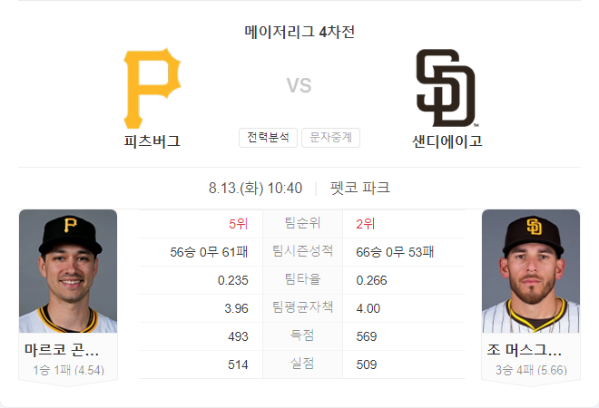 샌디에이고 파드리스는 최근 뛰어난 성적을 이어가고 있으며, 피츠버그 파이어리츠는 반등이 절실한 상황입니다. 조 머스그로브의 복귀와 함께 파드리스가 이번 경기를 승리로 가져갈 가능성이 큽니다.