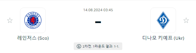 디나모 키예프는 이미 챔피언스 리그 예선 1라운드를 성공적으로 통과했으며, 세르비아의 파르티잔을 상대로 한 양 경기에서 합계 9-2의 압도적인 승리를 거뒀습니다. 지난 주말에는 우크라이나 프리미어리그에 데뷔하며 최소한의 득점으로 베레스를 상대로 승리를 거뒀습니다. 디나모 키예프는 탄탄한 수비력과 역습을 바탕으로 레인저스를 상대로도 좋은 경기를 펼칠 것으로 예상됩니다.
