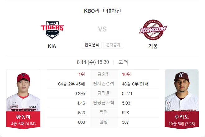8월 14일 KBO 크보 기아 타이거즈 VS 키움 히어로즈 타카짱 경기 예측 분석