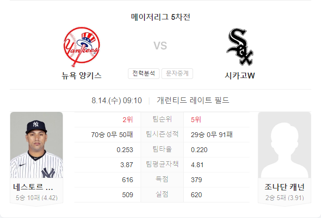 이번 경기는 강력한 타선을 자랑하는 뉴욕 양키스가 우세할 것으로 예상됩니다. 시카고 화이트삭스는 이번 시즌 전반적으로 어려움을 겪고 있으며, 양키스의 타선을 막아내기에는 역부족일 가능성이 큽니다.