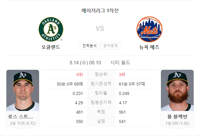 8월 14일 MLB 메이저리그 오클랜드 어슬레틱스 VS 뉴욕 메츠 타카짱 경기 예측 분석