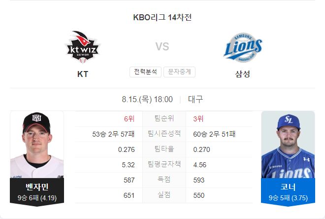 양 팀의 선발투수 모두 시즌 내내 꾸준한 성적을 기록하고 있어, 이번 경기는 투수전이 될 가능성이 큽니다. KT 위즈와 삼성 라이온즈의 맞대결은 현재 6승 6패로 팽팽한 상황이지만, 이번 경기에서는 최근 꾸준한 타격을 보여주고 있는 삼성 라이온즈가 조금 더 우세할 것으로 보입니다.