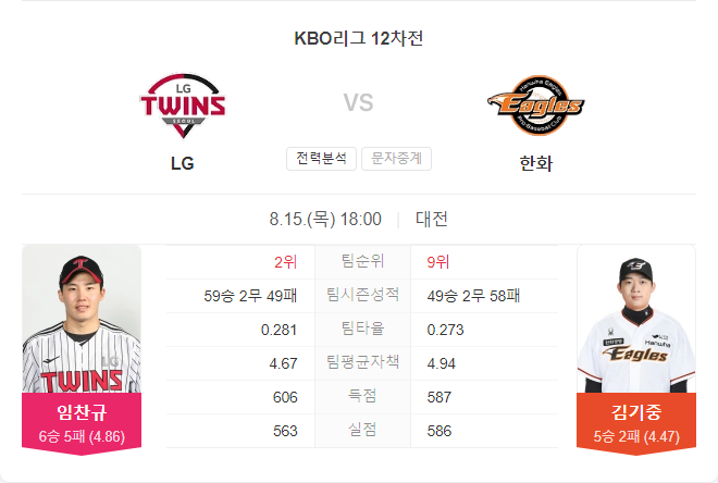 한화 이글스는 김기중을 선발로 내세워 LG 트윈스와의 경기에 나섭니다. 김기중은 이번 시즌 18경기에 출전해 5승 2패, 평균자책점 4.47, WHIP 1.65를 기록하고 있습니다.
