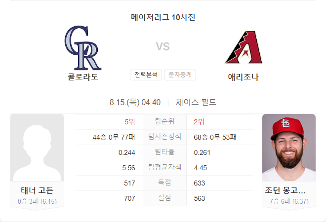 | 8월 14일 MLB 메이저리그 콜로라도 로키스 VS 애리조나 다이아몬드백스 타카짱 경기 예측 분석 (0) | 2024.08.13 |