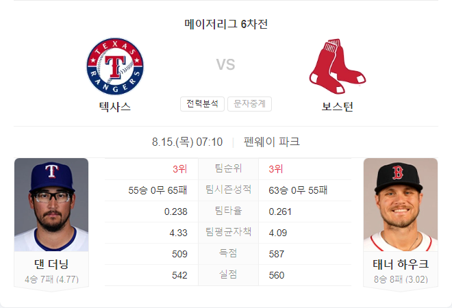 텍사스 레인저스와 보스턴 레드삭스의 경기는 두 팀의 전력이 크게 차이나는 만큼, 보스턴이 유리할 것으로 예상됩니다. 텍사스의 선발 투수 데인 더닝이 부진한 성적을 기록하고 있는 반면, 보스턴의 타선은 꾸준한 득점력을 보여주고 있습니다. 최종 스코어는 보스턴 레드삭스의 6-3 승리를 예측합니다.