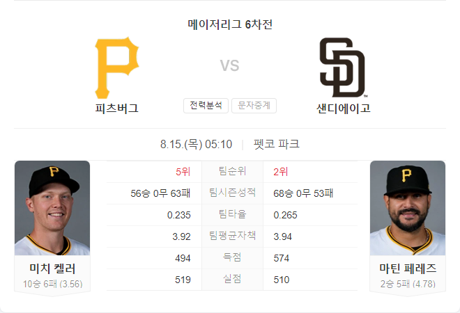 팀의 중심 타자인 앤드류 맥커친은 최근 4경기 연속 안타를 기록하며 팀의 공격을 이끌고 있지만, 팀 전체적으로는 득점력이 부족한 상황입니다. 미치 켈러는 시즌 24번째 선발 등판을 앞두고 있으며, 이번 시즌 10승 6패, 평균자책점 3.56을 기록하고 있습니다. 그는 팀의 가장 안정적인 선발 투수로 평가받고 있지만, 최근 다저스와의 경기에서는 4이닝 동안 7실점을 하며 부진한 모습을 보였습니다.