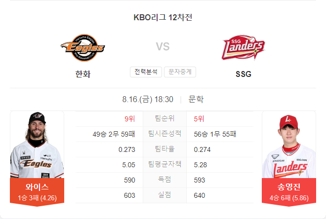 두 팀 모두 승리가 절실한 상황이지만, 한화는 이번 시즌 SSG를 상대로 강한 모습을 보이며 꾸준한 경기력을 유지해왔습니다. 최근 피칭에서 안정감을 되찾은 와이스를 앞세운 한화가 이번 경기에서도 승리를 거둘 가능성이 높습니다.