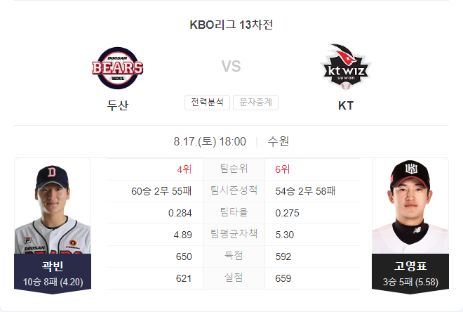 두산 베어스는 이번 경기에서 곽빈을 선발로 내세우며 연승을 이어가려 합니다. 곽빈은 이번 시즌 KT를 상대로 매우 강한 모습을 보였으며, 홈에서의 무실점 투구가 인상적이었습니다. 비록 최근 2경기에서 다소 흔들리는 모습을 보였지만, KT 상대로는 좋은 투구를 이어갈 가능성이 큽니다.