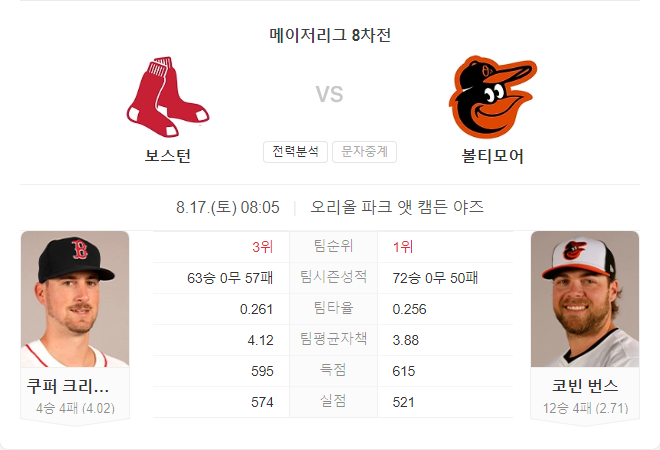 8월 17일 MLB 메이저리그 보스턴 레드삭스 VS 볼티모어 오리올스 타카짱 경기 예측 분석
