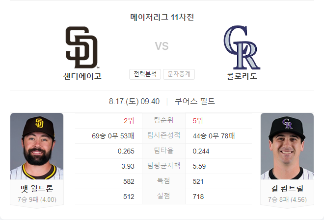 8월 17일 MLB 메이저리그 샌디에이고 파드리스 VS 콜로라도 로키스 타카짱 경기 예측 분석