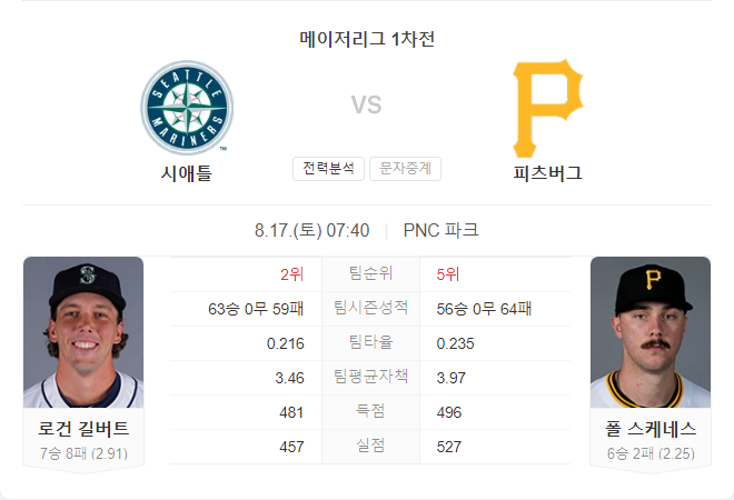 시애틀 매리너스와 피츠버그 파이어리츠 모두 최근 부진한 성적을 기록하고 있으며, 이번 경기는 두 팀의 에이스 투수들이 맞붙게 됩니다. 시애틀은 타선의 주요 선수들이 결장하거나 출전 여부가 불확실해 어려움을 겪을 가능성이 크며, 피츠버그는 홈에서 연패를 끊기 위해 필사적인 경기를 펼칠 것입니다.