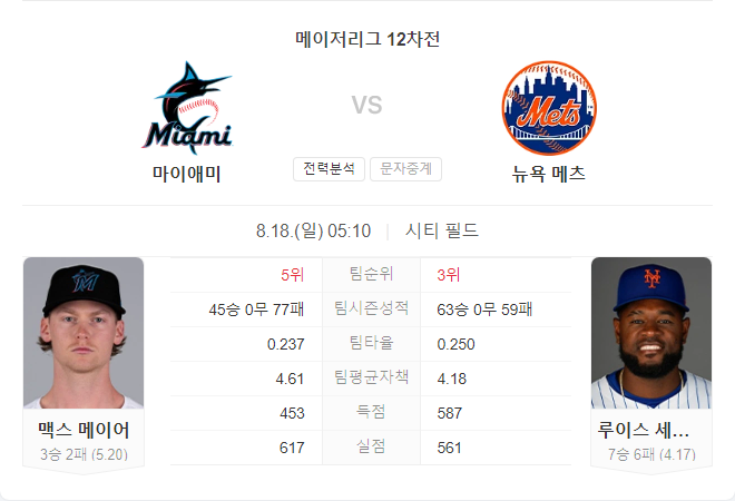 이번 경기는 뉴욕 메츠가 승리할 가능성이 있습니다. 비록 최근 경기에서 고전했지만, 루이스 세베리노가 안정적인 피칭을 되찾는다면 메츠가 승리를 거둘 수 있을 것입니다. 마이애미 말린스의 타선은 다소 기복이 있는 편이며, 맥스 메이어가 뉴욕의 강한 타선을 상대로 어려움을 겪을 가능성이 큽니다.