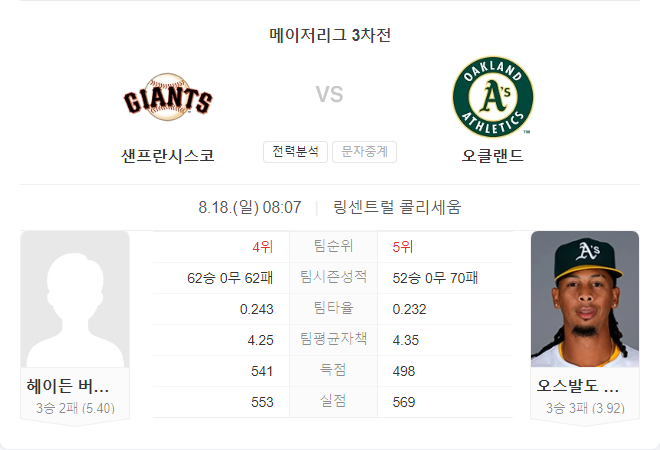 이번 경기는 두 팀의 선발 투수의 성적에 따라 결과가 크게 달라질 것으로 보입니다. 샌프란시스코 자이언츠는 헤이든 버드송의 안정적인 투구가 필요하며, 오클랜드 어슬레틱스는 오스발도 비도의 최근 상승세를 이어가야 할 것입니다. 두 팀 모두 경기력이 비슷하지만, 자이언츠가 조금 더 우세할 가능성이 높습니다.