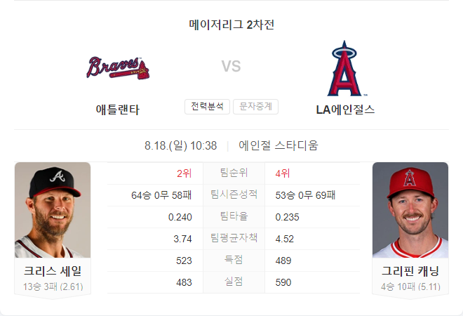 에인절스의 선발 그리핀 캐닝은 이번 시즌 4승 10패, 평균자책점 5.11로 기복 있는 모습을 보이고 있습니다. 최근 경기에서의 부진한 모습이 이번 경기에서도 지속된다면, 에인절스는 어려운 경기를 펼칠 가능성이 큽니다.