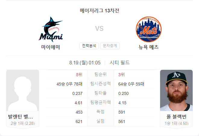 이번 경기에서 메츠는 새로 영입한 폴 블랙번을 선발 투수로 내세울 예정입니다. 블랙번은 최근 오클랜드 애슬레틱스와의 경기에서 부진한 모습을 보였지만, 시즌 전체적으로는 4.43의 평균자책점을 기록하며 안정적인 모습을 보여주고 있습니다.