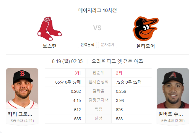 8월 19일 MLB 메이저리그 보스턴 레드삭스 VS 볼티모어 오리올스 타카짱 경기 예측 분석