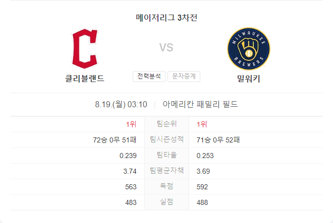 밀워키 브루어스는 이번 시리즈 첫 경기에서 클리블랜드를 상대로 승리하며 홈에서 좋은 흐름을 이어가고 있습니다. 밀워키는 경기당 평균 4.84점을 득점하며, 팀 타율 .254로 리그 8위, 출루율 .332로 3위, 장타율 .406으로 13위를 기록 중입니다.