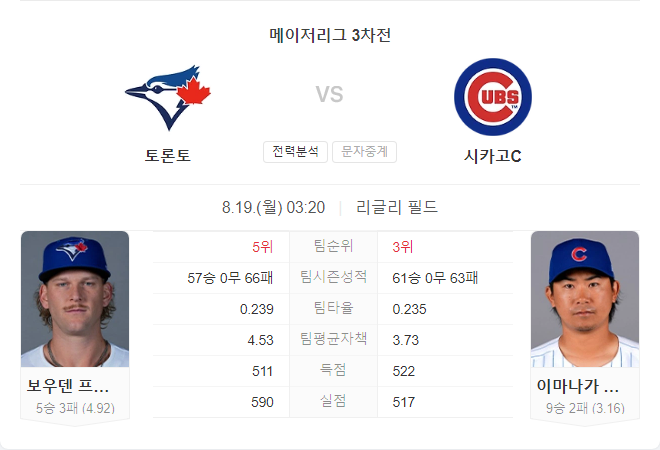 8월 19일 MLB 메이저리그 토론토 블루제이스 VS 시카고 컵스 타카짱 경기 예측 분석