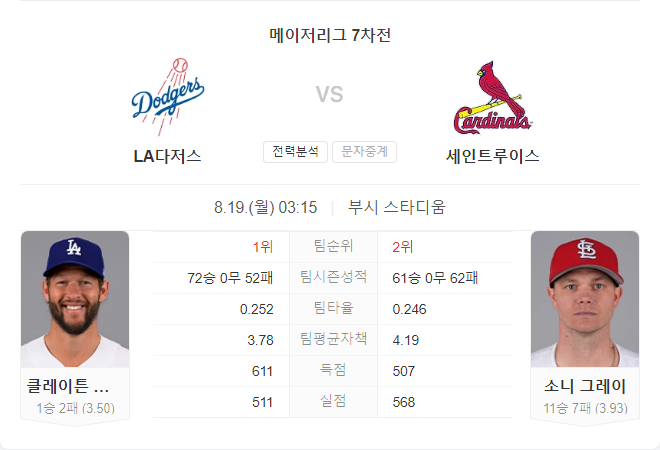 LA 다저스는 클레이튼 커쇼의 안정된 투구와 강력한 타선을 바탕으로 이번 경기에서 우위를 점할 것으로 보입니다. 세인트루이스 카디널스는 소니 그레이가 홈에서 좋은 성적을 기록하고 있지만, 다저스의 강력한 공격력을 막아내기 어려울 수 있습니다. 최종적으로 LA 다저스가 6-3으로 승리할 가능성이 큽니다.